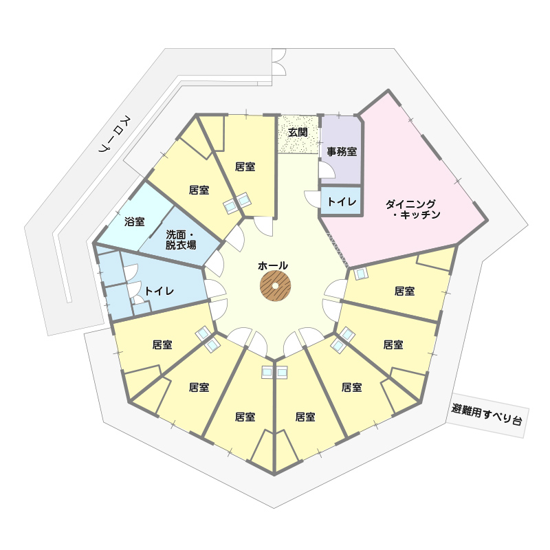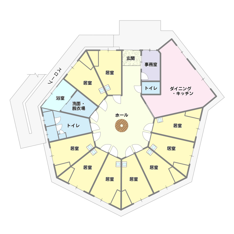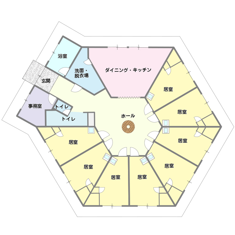 - 認知症の方が、少人数で共同生活を送りながら、他の利用者や職員との交流を通して精神的な安定を得て、その人らしい生活を尊厳をもって送られるよう支援する地域密着型の施設です。
